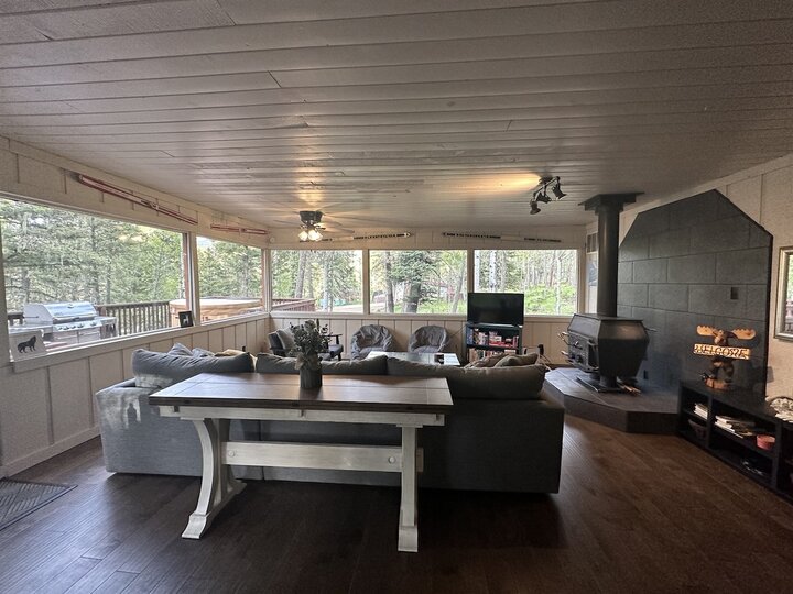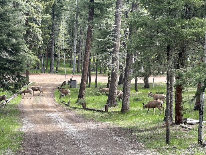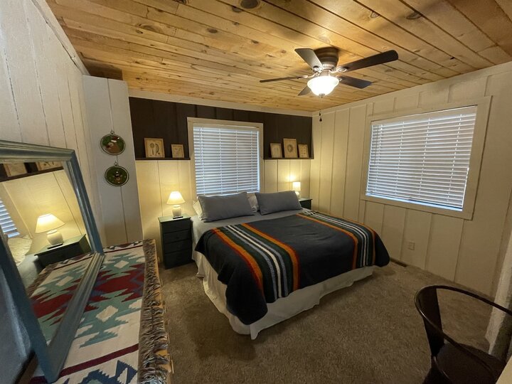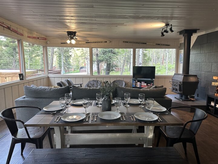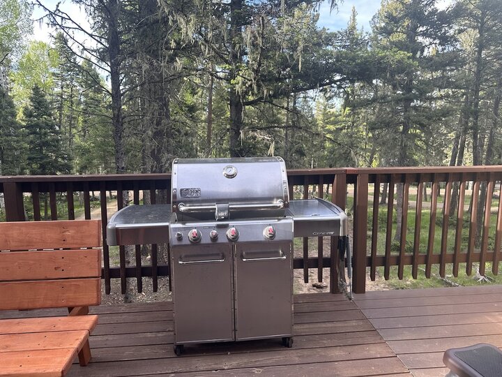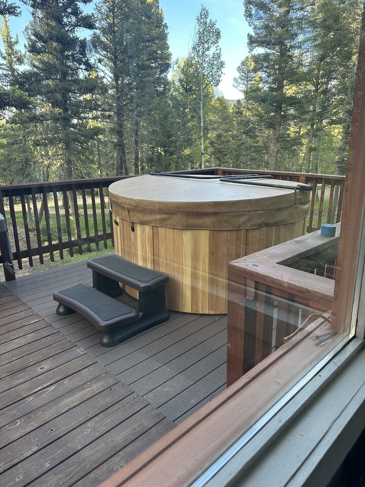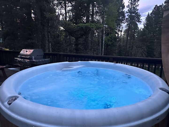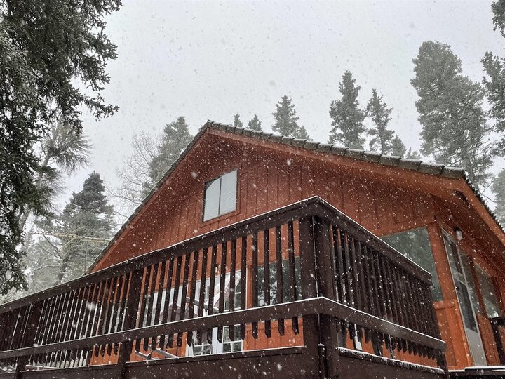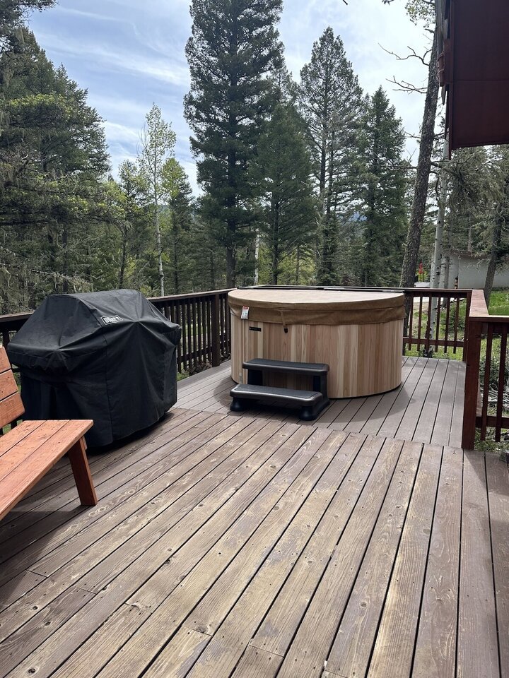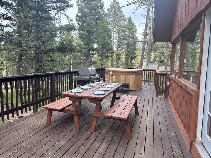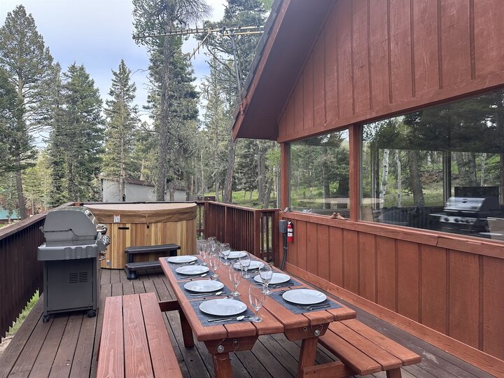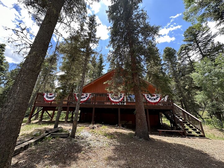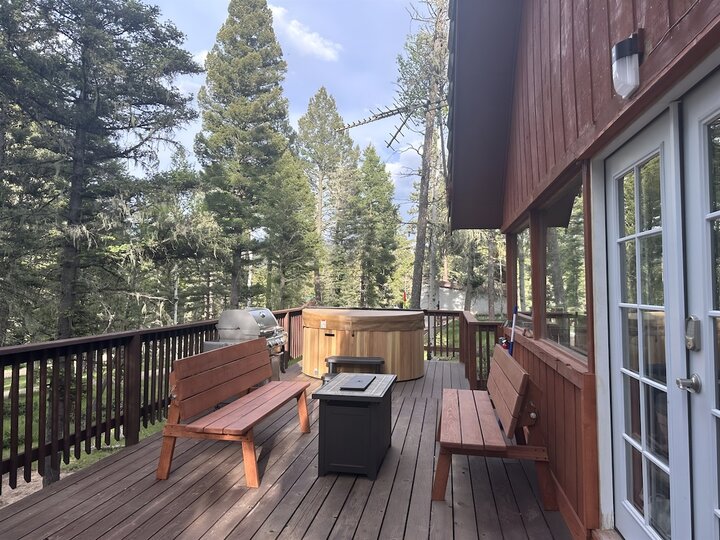 Relax with the family at this peaceful, pet friendly mountain home with panoramic views and a telescope. Enjoy the new hot tub or grill a meal on the deck surrounded by an acre of trees. Fast fiber internet for work or streaming your favorite movies. Our new Ms. Pac-Man game comes with DigDug, Super Pac-Man and more. Enjoy access to the Angel Fire trail system for endless hiking and biking. Cabin is a short walk to Monte Verde Lake for boating and fishing and a short drive to the golf course and...