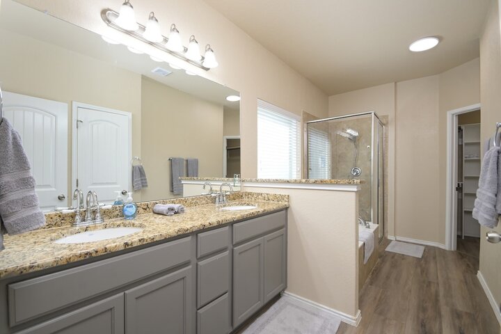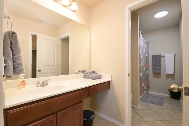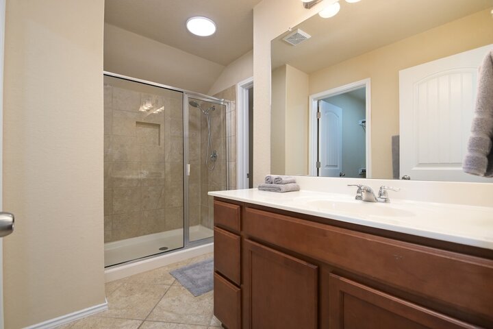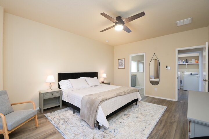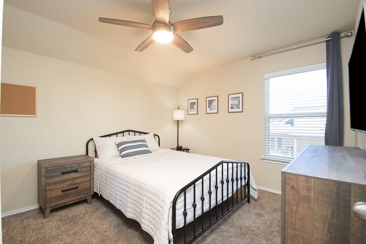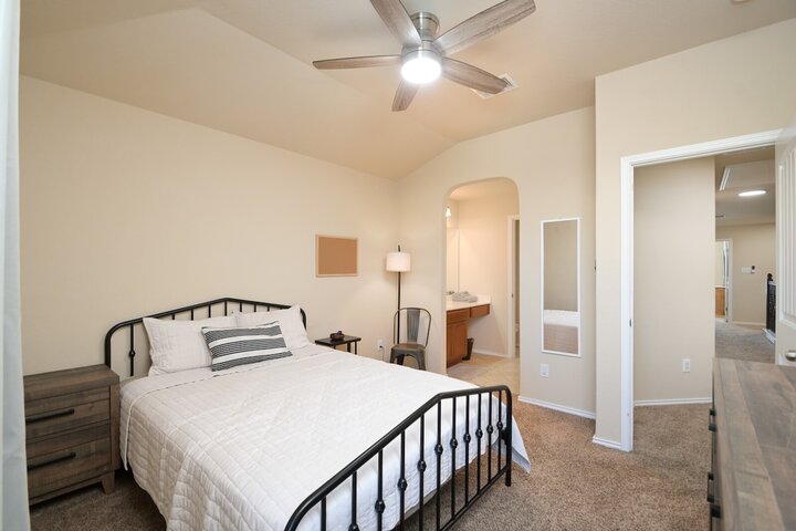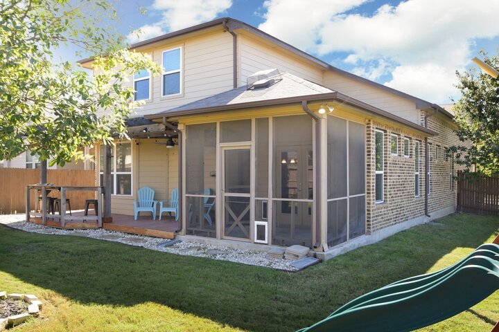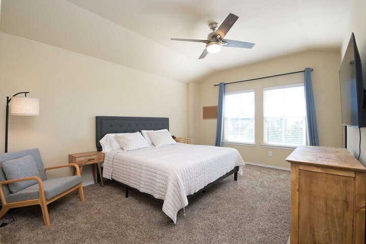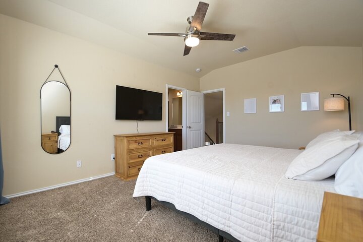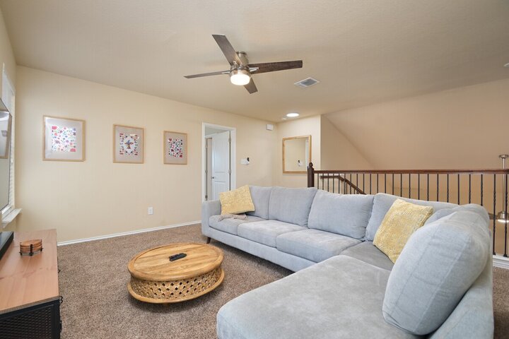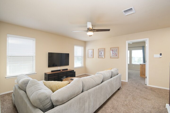 Welcome to this spacious 4-bedroom, 3.5-bath home in Cibolo, TX! Perfect for families or groups, this two-story retreat offers a fully equipped kitchen, two cozy living areas, and a private backyard with a covered patio. Two master suites provide a luxurious escape, plus two bedrooms with queen beds. Located near Randolph AFB, this pet-friendly home is ideal for extended stays. Military members on TDY/PCS orders, contact us for more details on how we can accommodate your lodging needs. Welcome ...