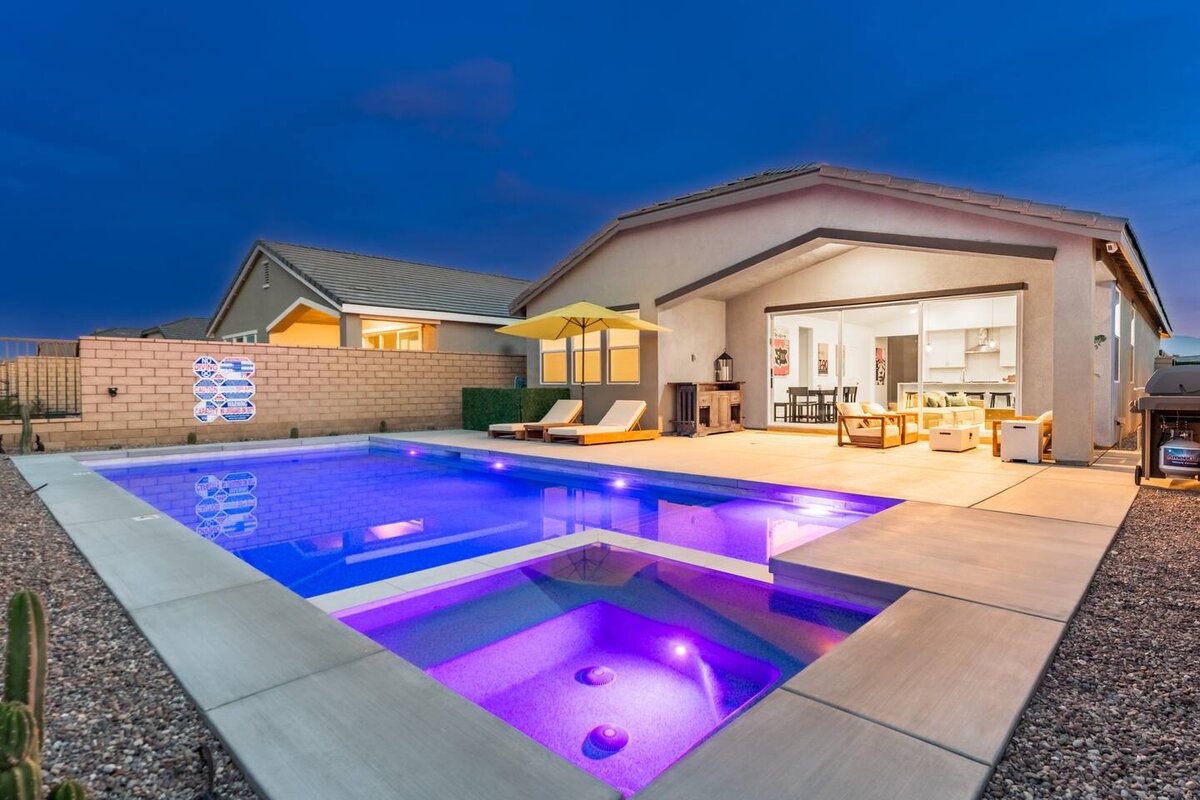 Step inside to a bright and spacious open-concept living area, featuring soaring ceilings and sliding glass doors that showcase a stunning backyard oasis. The cozy living room invites you to relax on the plush teal sofa, enjoy your favorite movies on the flat-screen TV, or share meals and laughter around the dining table with loved ones. The chef’s kitchen is truly inspiring, flooded with natural light from oversized windows that highlight white cabinetry and sleek quartz countertops. Equipped ...