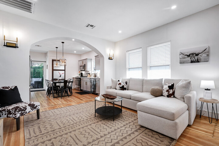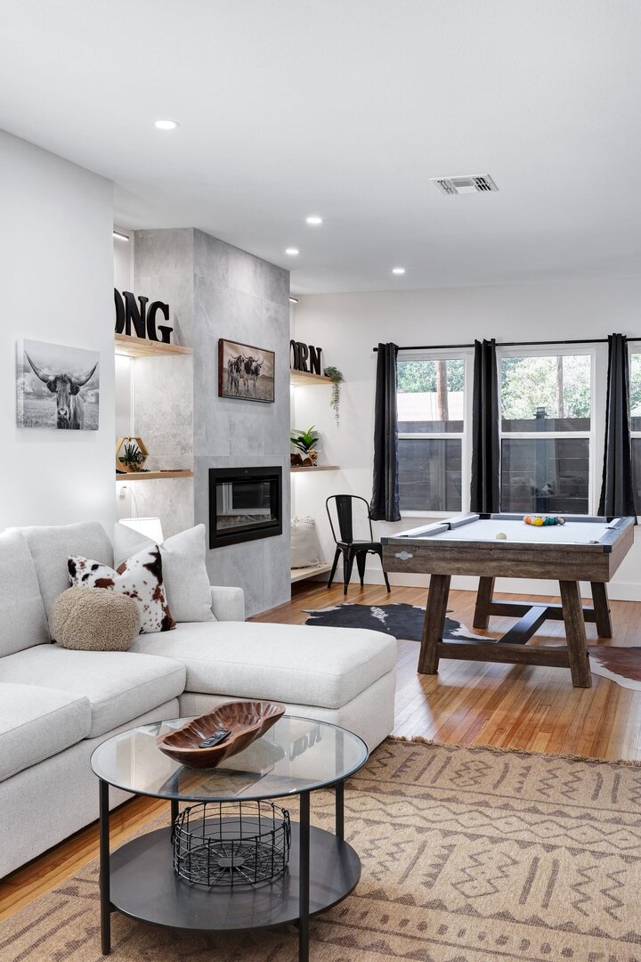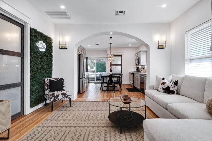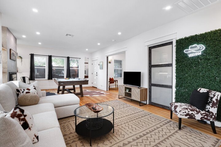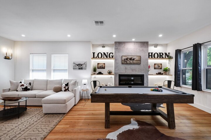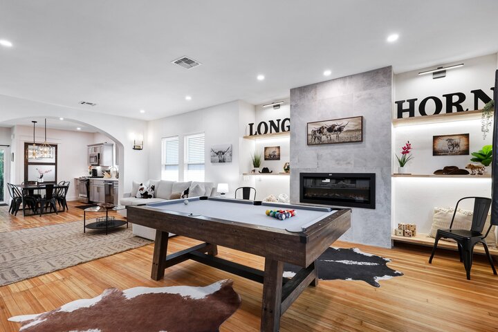 Welcome to Longhorn – A Birdy Vacation Rental This stylish San Antonio home offers the perfect mix of comfort and fun. Located minutes from downtown, it features a cozy living area, a fully equipped kitchen with stainless steel appliances, and a game room with a pool table. Unwind on the charming front porch or enjoy quality time with friends and family inside. Ideal for weekend getaways, family vacations, or business trips, Longhorn has it all! Lodging (Sleeps 6): Bedroom 1: King Bed Bedroom ...