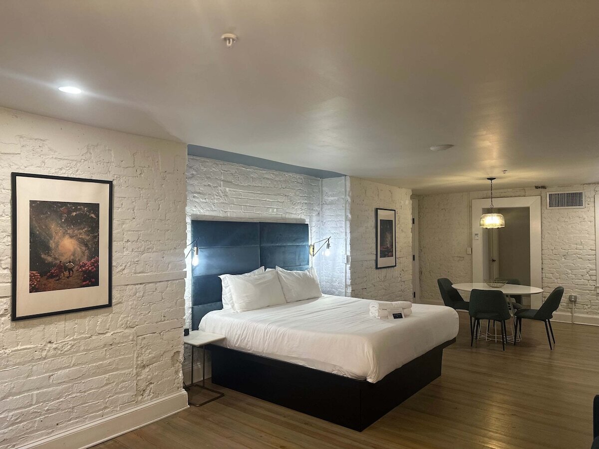 Welcome to The Present! This unique blend of historic and edgy design is the work of HGTV Designer Elizabeth Demos and the Baby Grand Agency. From your front window, enjoy views of Crawford Square with Horse-Drawn carriages passing regularly. Appreciate the custom art collection, relax in plush beds & linens, and unwind in the Hotel's private courtyard, exclusive to guests. A short walk takes you to Downtown Dining & Nightlife. This suite features an open-concept layout with a plush King bed an...
