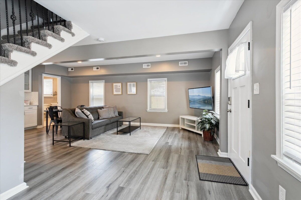 The whole group will be comfortable in this spacious and unique space. This a two Bedroom house not a studio. Each room can fit 3 people comfortably and there is a pull out couch downstairs I am available anytime to help with any questions you may have This is a Two Bedroom house with Two full Bathrooms